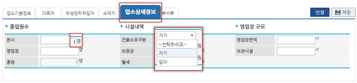본사 ①종업원 수와 ②건물소유구분 ③영업장면적 만 적으면 됩니다.