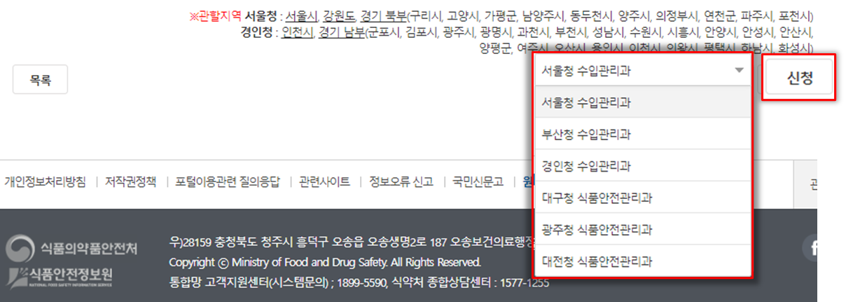 (우측 하단) 자신이 살고있는 곳과 가장 가까운 청을 골라 신청을 누릅니다.주변과 가까운청이 없다면 바로 아래사진 보면 '경인청'에 소속되어 있는 지역인지 확인하여 선택하면 됩니다.