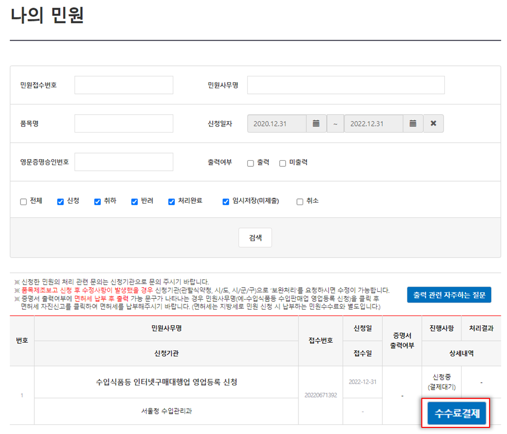 첨부를 했다면 조금 위에 저장 버튼 옆에 있는 신청버튼을 눌러서 신청완료를 합니다. 그럼 나의민원 페이지로 자동으로 들어가집니다. 우측 하단에 있는 버튼을 눌러 수수료를 결제하면 최종으로 신청이 완료됩니다.
