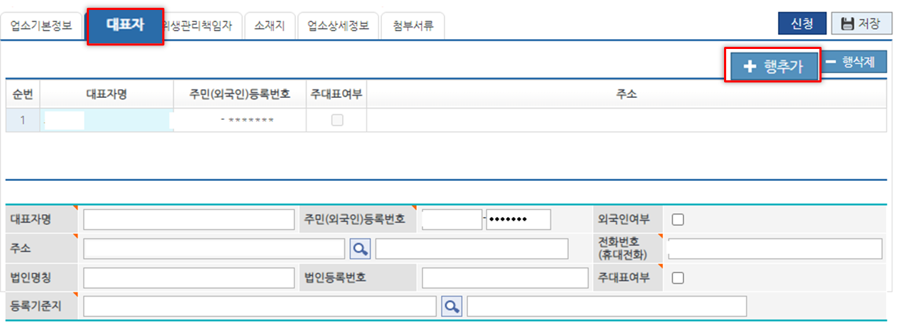 우측에 [+행추가]를 누른 후, 필수항목을 전부 입력해줍니다. [주대표여부] 체크도 꼭 해주셔야합니다.