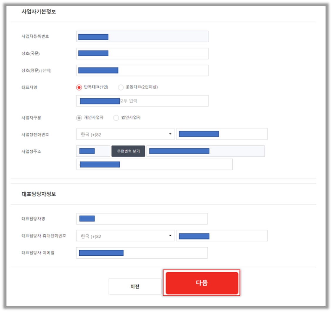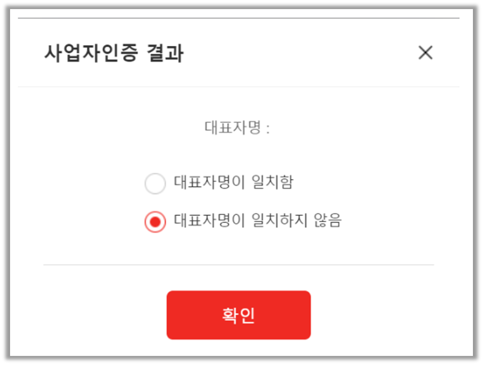 사업자 인증 결과 대표자명이 일치하지 않음으로 나오지만 그냥 확인버튼 누르시면 됩니다.