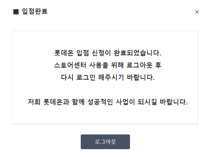입점이 완료되면 팝업창으로 안내 내용이 나오는데, 설명대로 로그아웃 후 다시 로그인하면 됩니다.